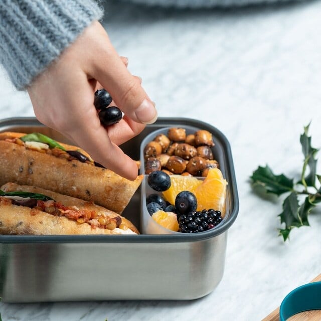 お野菜等の具材をたっぷり挟んだサンドイッチも、安心して持ち運びができる大容量のランチボックス。