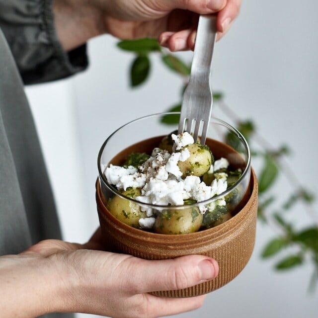 ケースごと温められるので、直に熱々のガラス容器に触れずに済み火傷を防ぎます。